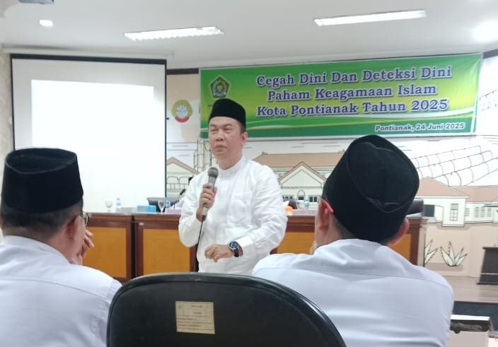Pada Selasa, 24 Juni 2025, Kantor Kementerian Agama Kota Pontianak menyelenggarakan kegiatan penguatan kapasitas bertajuk “Cegah Dini Dan Deteksi Dini Paham Keagamaan Islam Kota Pontianak. Kegiatan ini secara resmi dibuka oleh Kepala Kantor Kementerian Agama Kota Pontianak, H. Ruslan, S.Ag., M.A, yang dalam sambutannya menegaskan urgensi deteksi dini terhadap berbagai bentuk penyimpangan paham keagamaan. Ia menekankan bahwa penyuluh agama Islam memiliki posisi strategis dalam menjaga umat dari infiltrasi ideologi keagamaan yang menyimpang melalui pendekatan edukatif, preventif, dan dialogis.